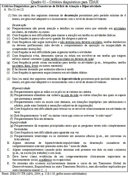 MOYSÉS, Maria Aparecida Affonso; COLLARES, Cecília Azevedo Lima. Dislexia e TDAH: uma análise a partir da ciência médica. In: CONSELHO REGIONAL DE PSICOLOGIA DE SÃO PAULO (CRPSP); GRUPO INTERINSTITUCIONAL QUEIXA (GIQE). Medicalização de crianças e adolescentes: conflitos silenciados pela redução de questões sociais a doenças de indivíduos. São Paulo: Casa do Psicólogo, 2011. p. 71-110.